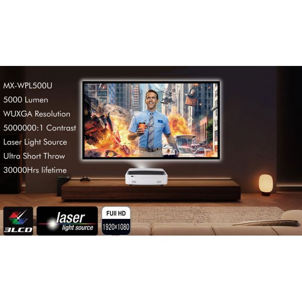 SMX MX-WPL UST Laser Projector combines a brilliant 5000-lumen laser engine with spectacular WUXGA resolution to deliver a breathtakingly bright and incredibly detailed picture. Place it inches from your wall and transform any room into a stunning, large-scale cinema. It is engineered for the discerning viewer who refuses to settle for anything less.